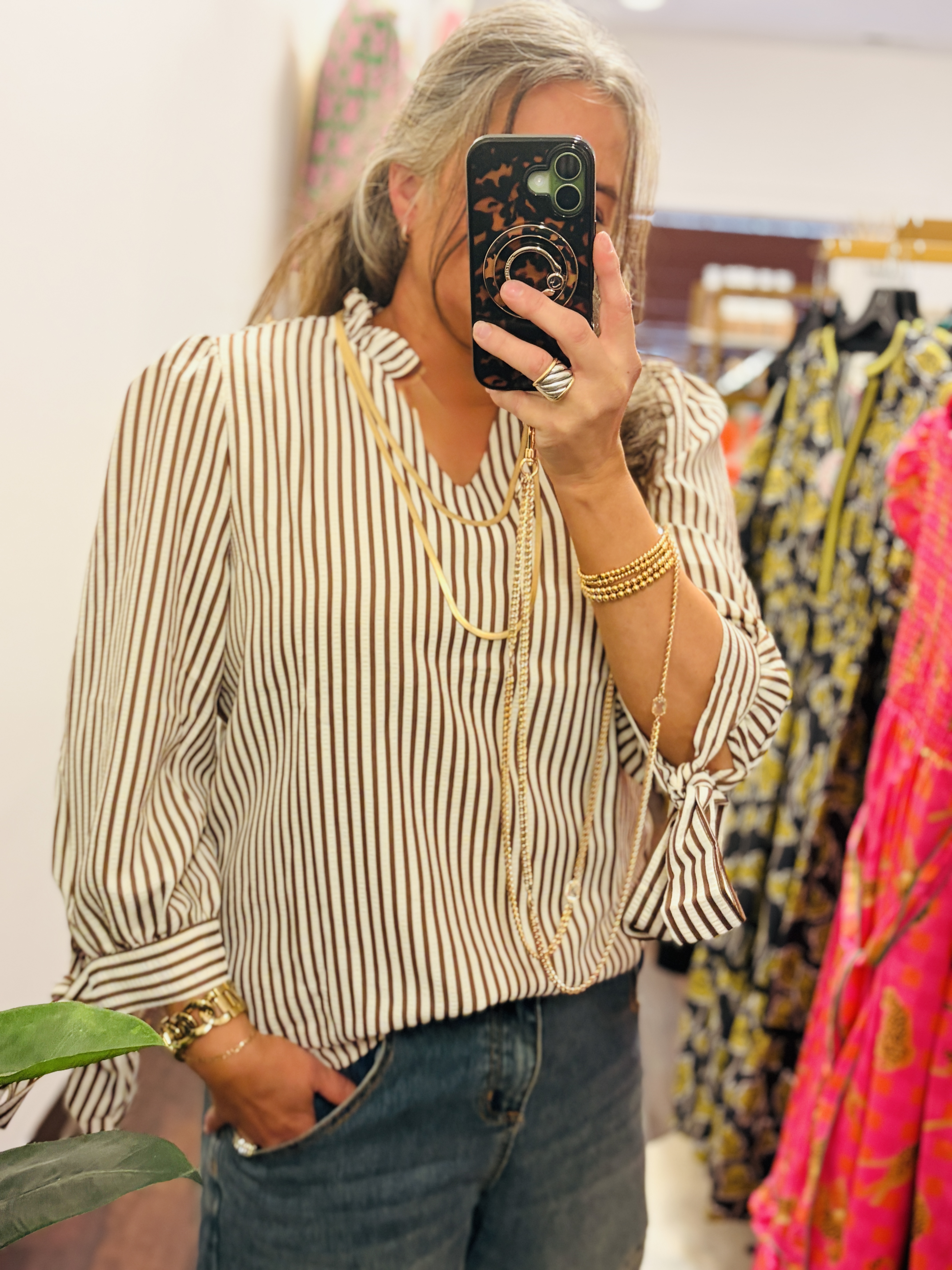 Striped V neck Ruffle Neck Tie Sleeve Blouse
