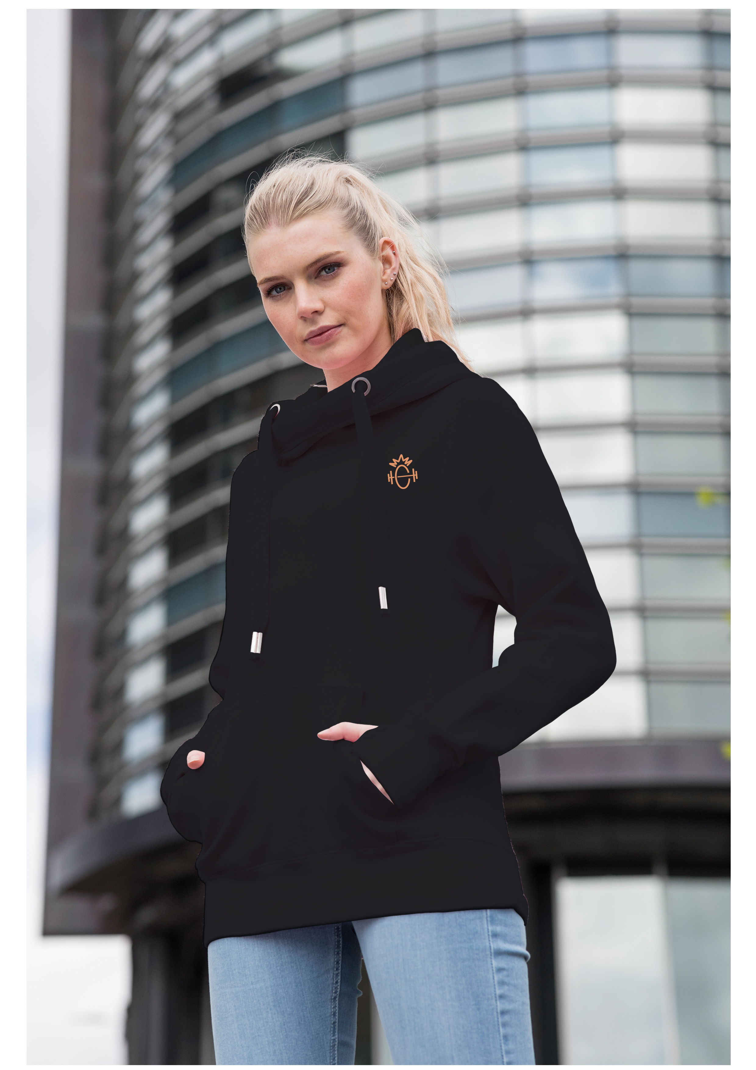 Super soft black cross neck hoody with logo